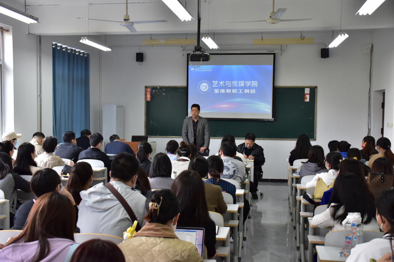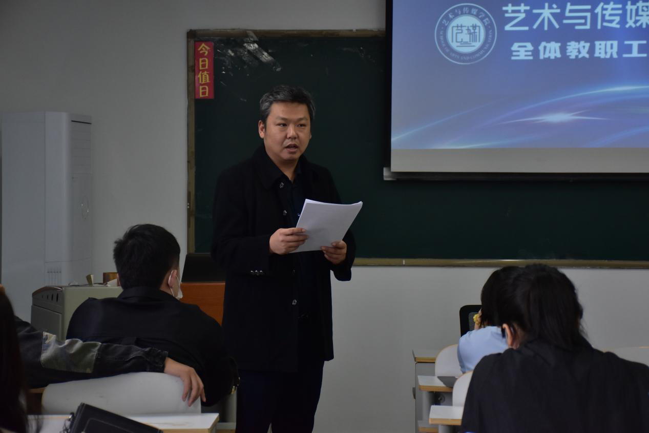 为做好新老生返校报到后的思想政治工作,进一步提升疫情防控常态下线下教育教学质量,10月7日,学校党委书记常新平在有关部门的陪同下,利用艺术与传媒学院教职工例会的机会,同全院教师进行座谈交流。艺术与传媒学院副院长李罡和全体专职教师参加会议,学院党总支书记付华轩和全体辅导员线上参会。会议由艺术与传媒学院院长陈辉主持。