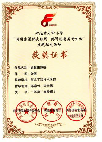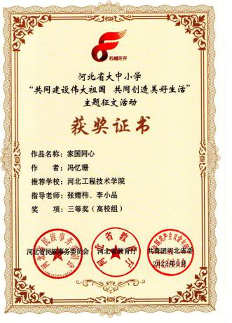 本次活动共有全省市(含有定州、辛集市)、雄安新区等56所高等院校参与,艺术与传媒学院积极组织学生以自身经历讲述中国发展,将自己的所思、所感、所悟融注于文字。专业教师对参赛学生进行写作指导,提供经验,完善作品,经过层层选拔,作品《她越来越好》获二等奖,《家国同心》获三等奖。