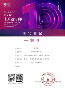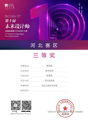 为提升教师创新能力、优化师资力量,打造高素质、专业化的教师团队,艺术与传媒学院组织师生参加“第十届未来设计师全国高校数字艺术设计”大赛。其中,网络与新媒体专业教师发挥专业特长,斩获河北赛区教师组一等奖两项,二等奖一项,三等奖一项。