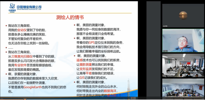 报告会上,杨海成院长从核工业航测遥感中心的中心工作情况出发,阐明了当前时代对测绘新人才的需要。杨海成院长从一封测绘人的情书、从传统测绘出发,讲解摄影测量的概念、内涵、发展历程、分类、平台等,并结合摄影测量现状,详细介绍了倾斜摄影测量,分析了未来摄影测量发展方向。最后针对学生提出的问题进行逐一解答,并对学生未来的发展指明了方向。