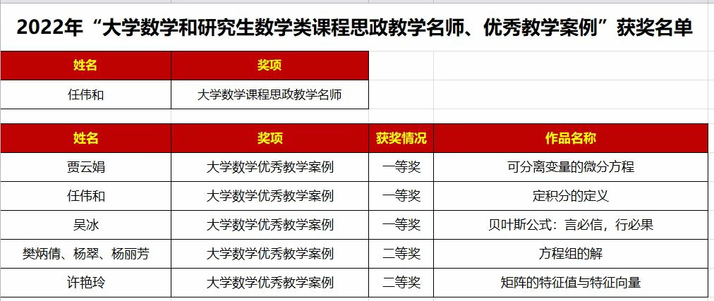 近日,河北省大学数学和研究生数学类课程思政教学名师和优秀教学案例评选结果揭晓,我校数学教师再创佳绩。其中,任伟和被评为思政教学名师,贾云娟、任伟和、吴冰分别被评为优秀教学案例一等奖,樊炳倩、杨翠、杨丽芳团队、许艳玲分别被评为优秀教学案例二等奖。