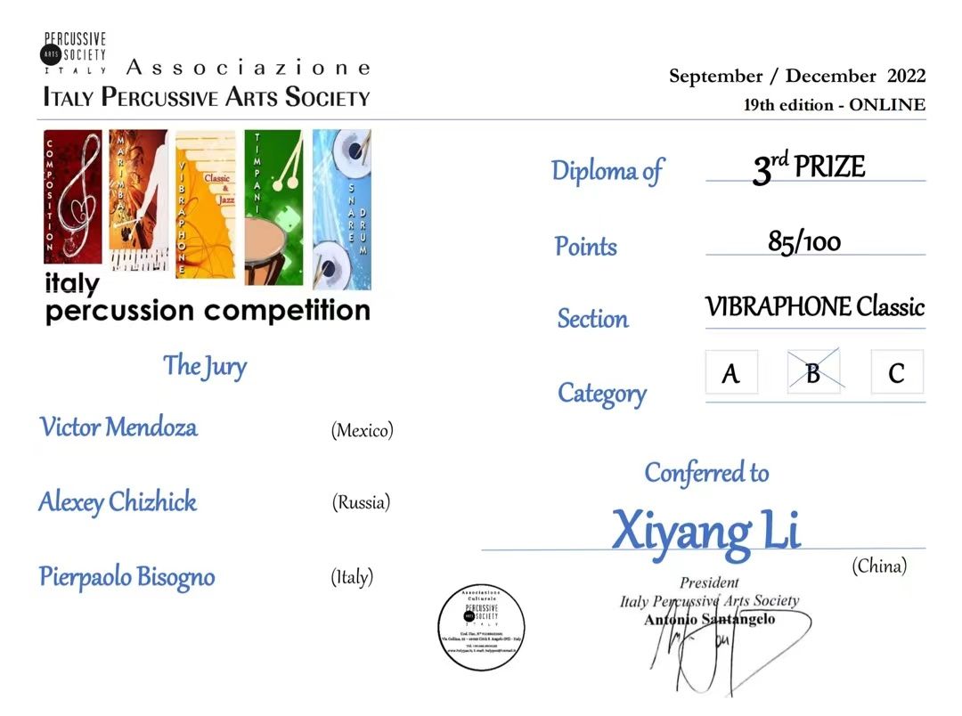 近日,第十九届意大利PAS国际打击乐大赛落下帷幕。经过三轮比赛的角逐,艺术与传媒学院青年教师李喜洋荣获本次比赛专业组三等奖。