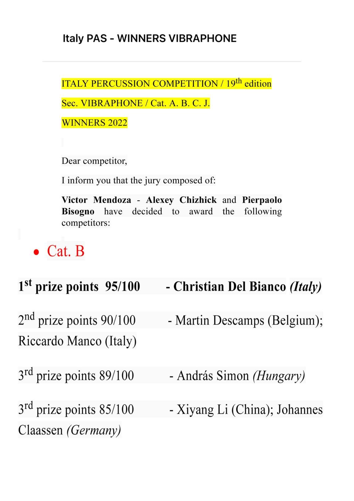 PAS·意大利国际打击乐大赛由PAS·意大利国际打击乐艺术协会举办,致力于为各国参与者提供“广泛参与性、文化多样性、专业互补性”的世界级打击乐艺术盛宴,来自奥地利、德国、希腊、西班牙、中国、美国、英国、日本、意大利等33个国家的百位参赛选手共同参与,历时三个月,包括2022年9月11日至9月20日的初赛、10月10日至10月23日的复赛以及11月10日至11月23日的决赛三轮筛选,来自不同国家、不同地域的多元化音乐产物,在国际化的舞台上焕发光彩。现代时尚元素的国际流行打击乐代表作、各个国家民族的传统音乐作品,在此次比赛中竞相亮相,表演者们切磋技艺,打磨专业,进一步提升能力,获得专业上的跨越式提升。