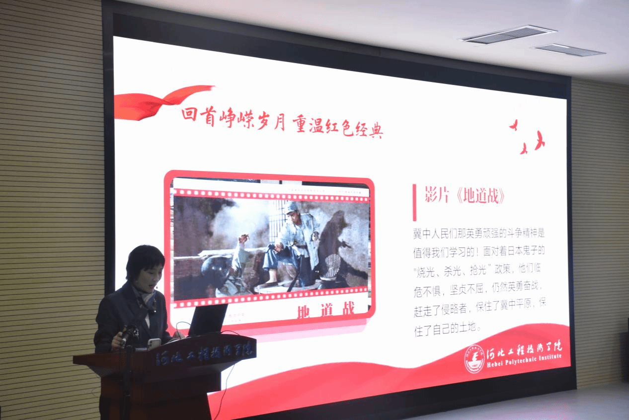 第二部影片《地道战》,在观看影片时,同学们随着故事情节的跌宕起伏大喜大悲,为剧中人物的幽默捧腹大笑,为主人公的英勇正义热烈鼓掌。当主讲人抛出问题,是什么促使他们这样步调统一、携手并肩地进行战斗?同学们异口同声地说道,是我们的民族魂、爱国情怀。