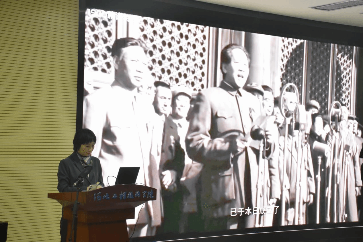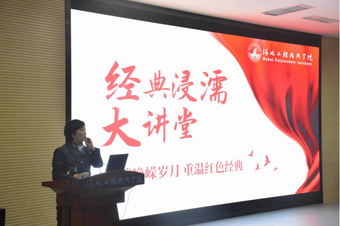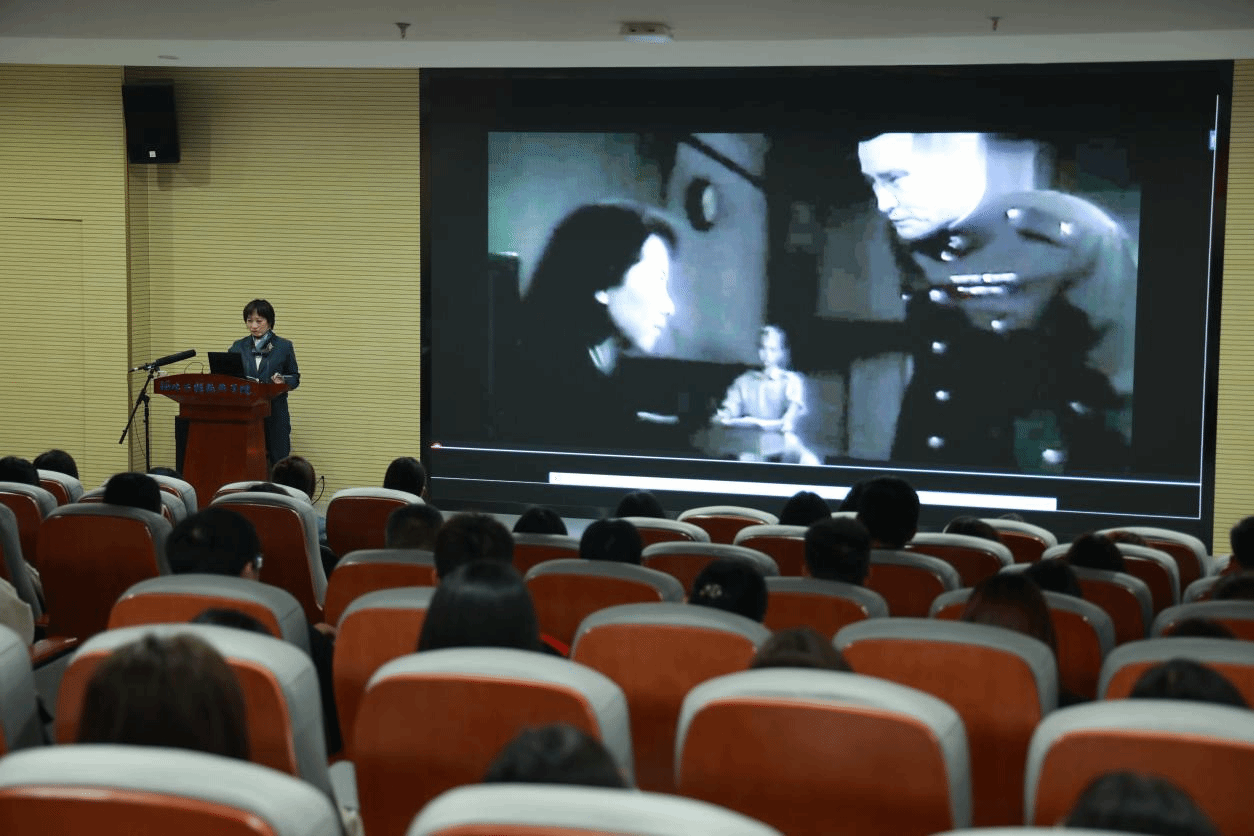 “以美润心,美美与共”,通过与孙妍老师讲解,一同回顾红色经典,就好似完成了一次时光之旅,重温峥嵘岁月。开篇在歌剧艺术片《洪湖赤卫队》的选段中拉开了帷幕,主讲人孙妍讲述到,这个创作于五六十年代的优秀歌剧,因其荡气回肠的旋律而红遍神州大地,经过了半个世纪的洗练雕琢,成为中国民族歌剧的一面旗帜。当“洪湖水、浪打浪”的曲调响起,在场师生随声唱和,民族的记忆被唤醒,歌唱家王玉珍演唱的《看天下劳苦人民都解放》更是荡气回肠,催人泪下。