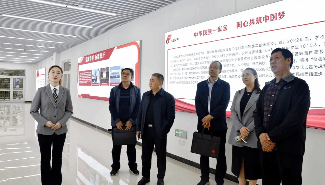 5月5日下午,石家庄市民宗局局长孙世煦、副局长熊国平和民族处戴晓辉处一行到我校调研指导民族宗教工作,党委书记常新平、党政办公室主任郭静、艺术与传媒学院院长陈辉等陪同调研。民宗局领导深入学校校展室、民族团结进步示范展区和艺术与传媒学院录音棚、音乐厅等场所调研,详细查看和交流了学校民族团结进步创建工作成果、活动场所规范化建设、音乐作品创作及第十一届少数民族传统体育运动会表演项目准备情况,并与常书记、艺术与传媒学院师生进行了交流,广泛听取意见建议。