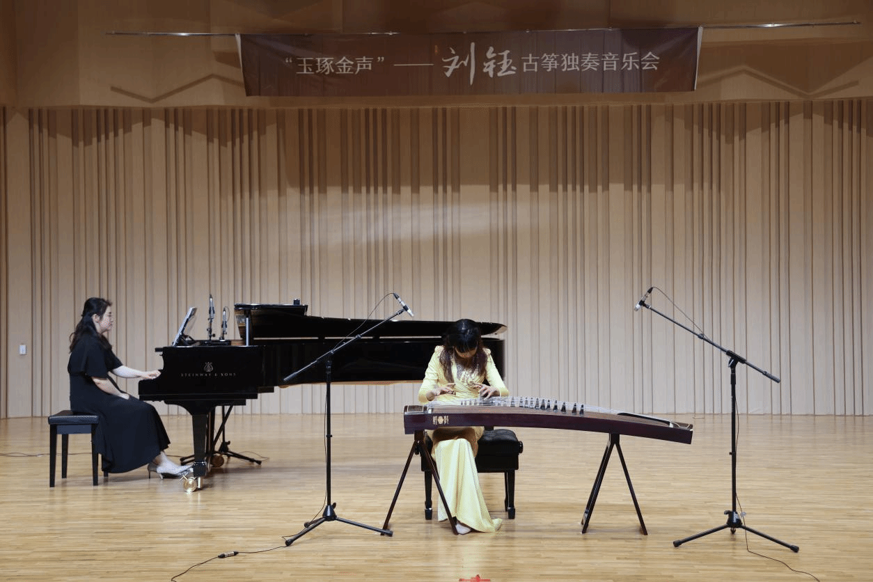 第二首曲目《桃花源》,由器乐系副主任、钢琴艺术指导胡睿担任钢琴伴奏。筝与钢琴交织的旋律如同一叶小舟穿行于溪流间,误入迷途后辗转间却意外发现世外桃源,溯溪而行,桃林遍野,让人忘却尘世的苦恼。刘钰老师和胡睿老师用默契的配合,将筝与钢琴这两件乐合二为一,向观众展现了古筝强大的包容性与适配性。