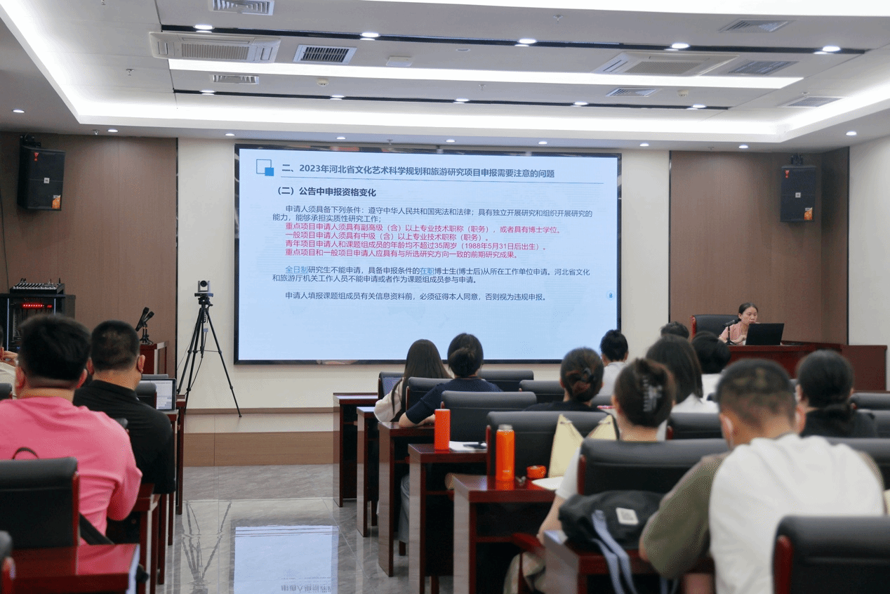 为提高教师教学科研水平,推进2023年河北省文化艺术科学规划和旅游研究项目申报工作。5月26日下午3点,艺术与传媒学院邀请了河北省文化和旅游研究院党总支书记、院长赵慧丽,在图书馆第一会议室举办了题为“河北省文化艺术科学规划和旅游研究项目申报培训”的科研讲座,艺术与传媒学院院长陈辉以及教师代表参加了此次讲座。