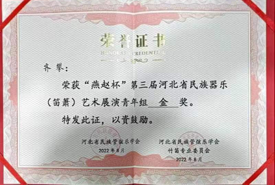近日,第三届河北省民族器乐(笛箫)艺术展演活动在省会石家庄顺利举行,艺术与传媒学院器乐系教师齐攀在决赛中斩获金奖,充分展示了我校教师的专业水平和教学实力。