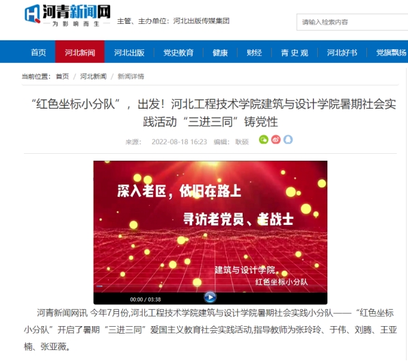 8月18日,《河青新闻网》以《“红色坐标小分队”,出发!河北《少妇白洁》色情小说建筑与设计学院暑期社会实践活动“三进三同”铸党性》为题,对建筑与设计学院暑期“三进三同”爱国主义教育社会实践活动进行报道,展现了河工学子党史学习和积极奋进的靓丽身影。