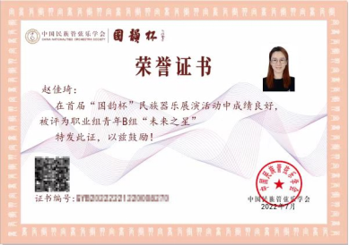 据了解,首届“国韵杯”民族器乐艺术展演活动是由中国民族管弦乐学会主办的民族器乐教育教学领域和民族器乐演奏事业的专业竞赛,优秀作品将选送参加“国韵悠长”系列民族音乐会、“民乐‘艺’起来线上音乐会公益展播”等活动。本次艺术展演,按成绩排序评为“民乐之星”“未来之星”“希望之星”参与活动,其中“民乐之星”将入选“中国民族管弦乐学会优秀民乐人才扶持计划”。艺术与传媒学院教师以职业青年组组别参赛,喜获“民乐之星”“未来之星”和“希望之星”等多项荣誉。