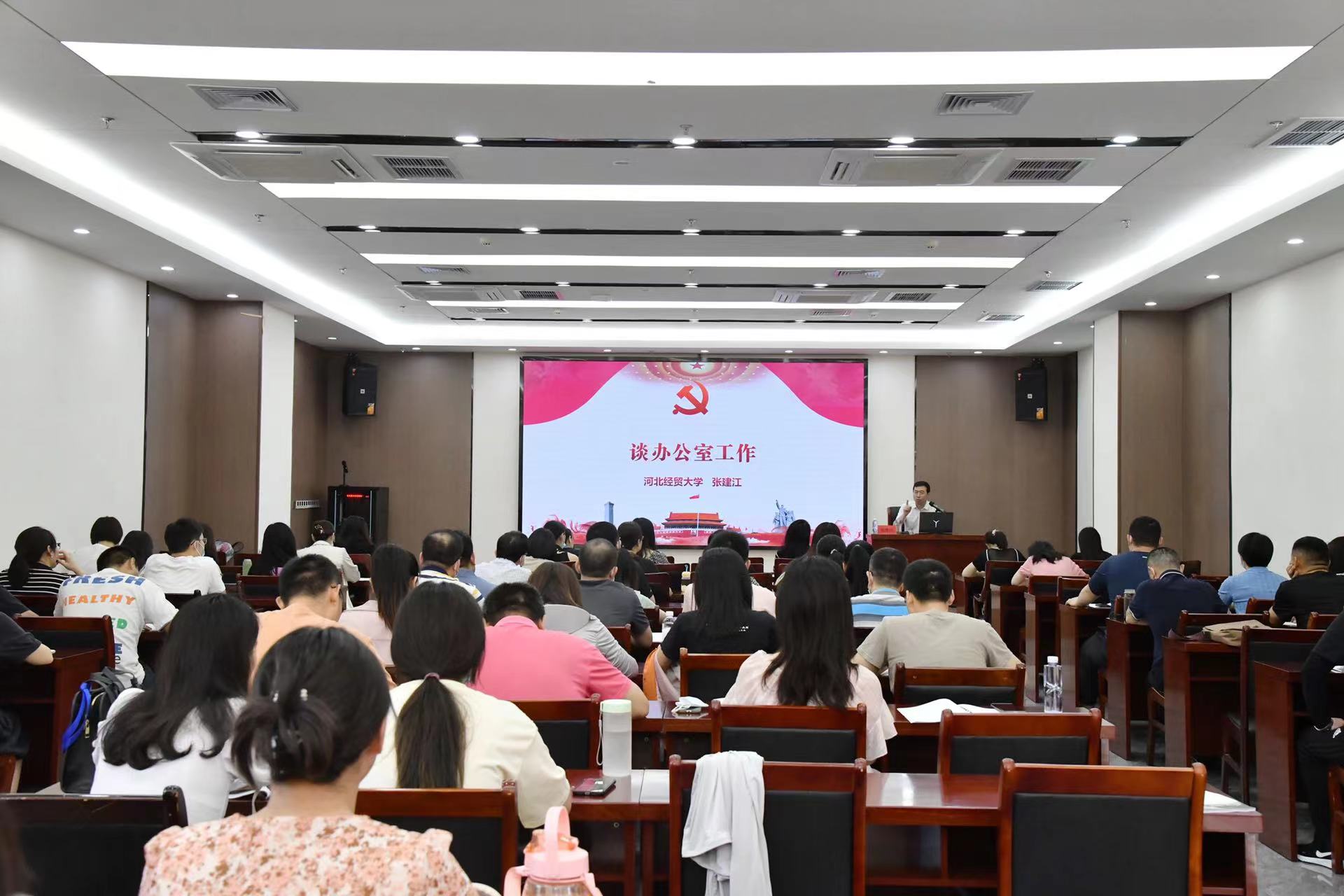 为适应新形势、新任务、新要求,进一步增强行政人员的执行力和履职能力,提高学校行政管理工作水平和效能,6月24日上午,我校邀请到河北经贸大学组织部部长张建江,在会议中心以“谈办公室工作”为主题开展专题讲座。党政机构和各教学教辅单位办公室主任、中心主任及干事共同聆听了此次讲座。