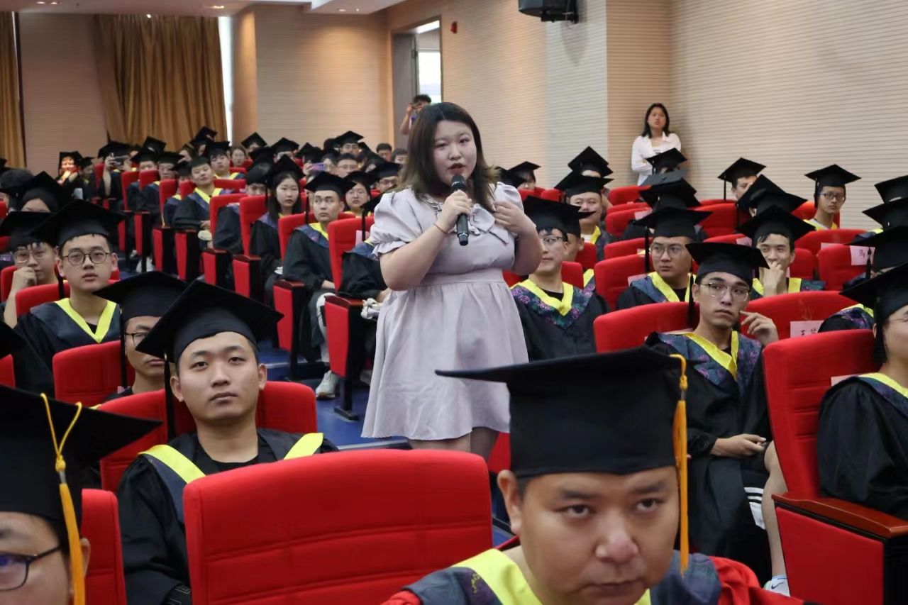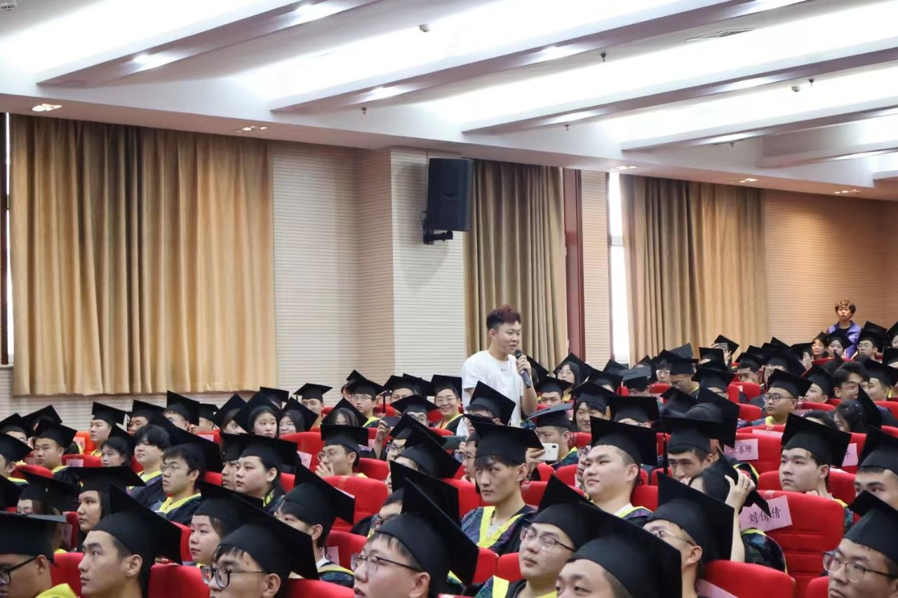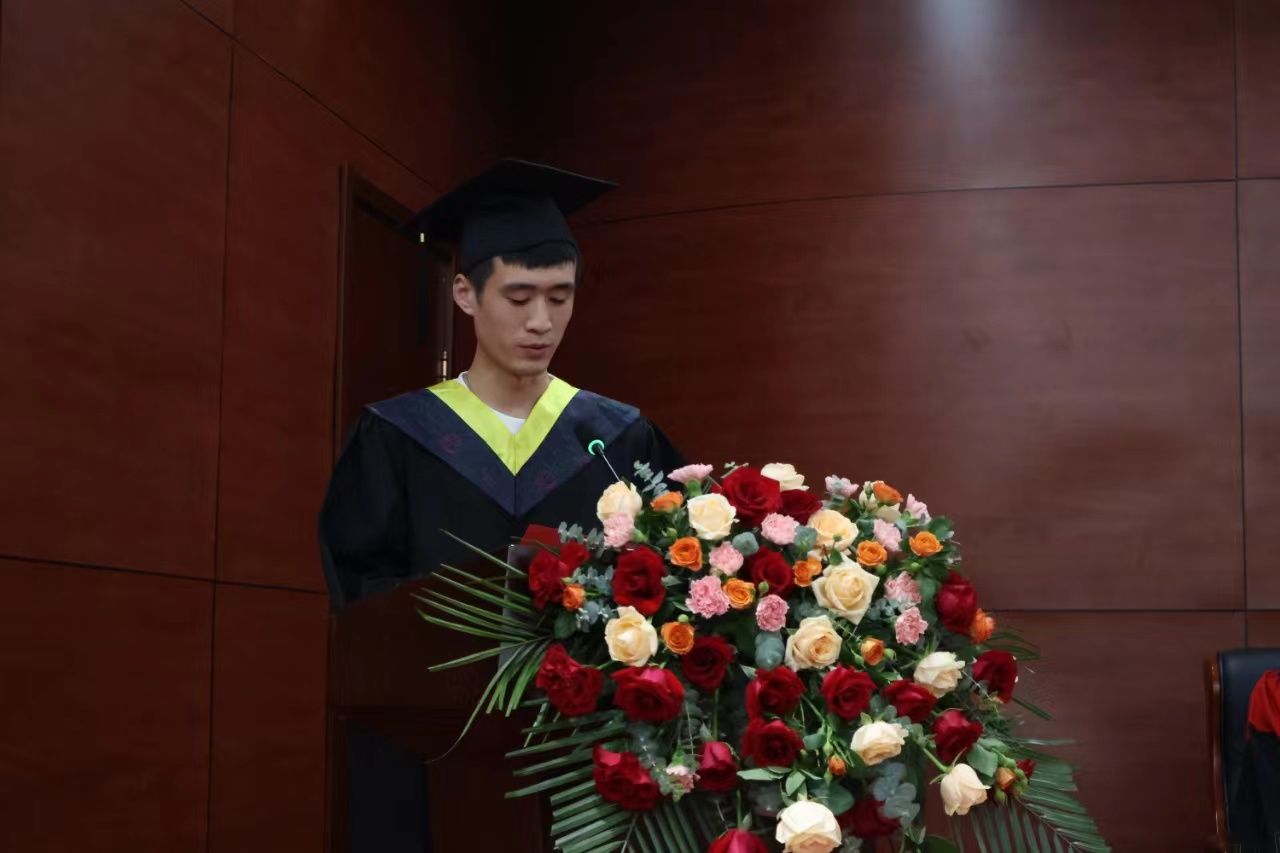 随后,专职教师代表杨志云老师从遗憾、眷恋、学校变化带领同学们回忆大学时光,寄语未来,嘱咐同学们要终身学习,牢记“修德凝道”的校训,做四有青年。毕业班辅导员代表韩京兴老师嘱托同学们要不断奋斗,坚持梦想,做追梦人,要在奋斗中释放青春激情,追逐青春理想,为祖国建设添砖加瓦。最后,优秀毕业生代表梁月鑫同学发言,他回忆四年时光,感谢母校培养、师长指引、亲友关心与同窗陪伴。他表示:追梦的终极意义并非到达终点,更重要的是在奔跑中观察周遭、洞察自我、积累经历、勇敢迈步,要以习近平总书记的嘱托与各位同学共勉。