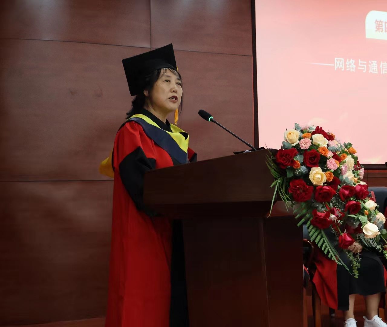 网络与通信学院院长甄增荣在致辞中表达了对全体毕业生衷心的祝贺和美好的祝愿,同时提出殷切希望:希望2023届毕业生厚植家国情怀,以坚定信念引领青春航向;希望同学们发扬进取精神,以奋斗姿态擦亮人生底色;希望同学们强化创新意识,以开拓精神勇担时代使命;希望同学们淬炼坚毅品格,以博大胸怀赋能追梦旅程。同学们是国家发展的亲历者,也是国家建设的生力军。在未来的人生道路上,希望大家心怀大爱,目有山河,共同参与、共同见证强国建设。