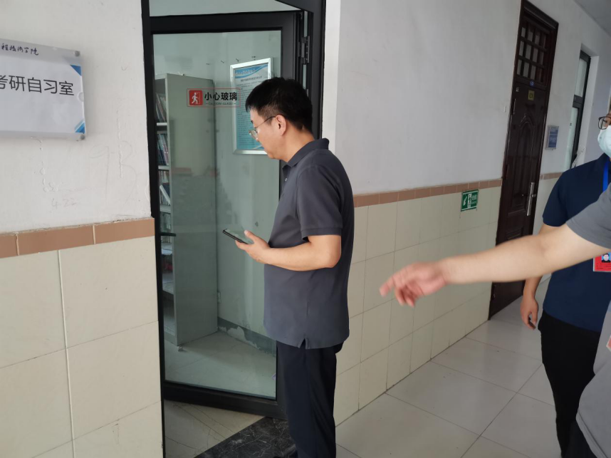 检查前,刘助理特别强调:假期校内施工项目较多,必须严格遵守学校施工安全管理规定,规范用火用电,严防发生事故;其次,重点检查办公室违规使用高功率电器的情况,保证教学楼内消防安全,避免发生火灾;再次,对已封教室及宿舍门窗关闭情况进行检查,对不合格情况责成所属单位进行整改;最后要规范校内交通秩序,保障在校人员人身安全。