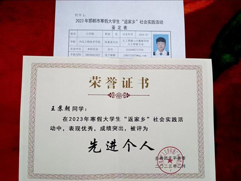 为深入学习党的二十大精神,贯彻落实习近平总书记在2023年新年贺词中对新时代青年的殷切嘱托,认真落实习近平总书记关于青年工作的重要思想,投身于家乡建设的伟大实践之中,从实践中增本领、长才干,在以中国式现代化全面推进中华民族伟大复兴和全面建成社会主义现代化强国的征程中贡献青春力量。人工智能与大数据学院2021级人工智能三班王苏朝同学在寒假期间积极响应“桑梓计划”,通过到梦空间APP报名参与了广平县寒假返家乡大学生实践活动。