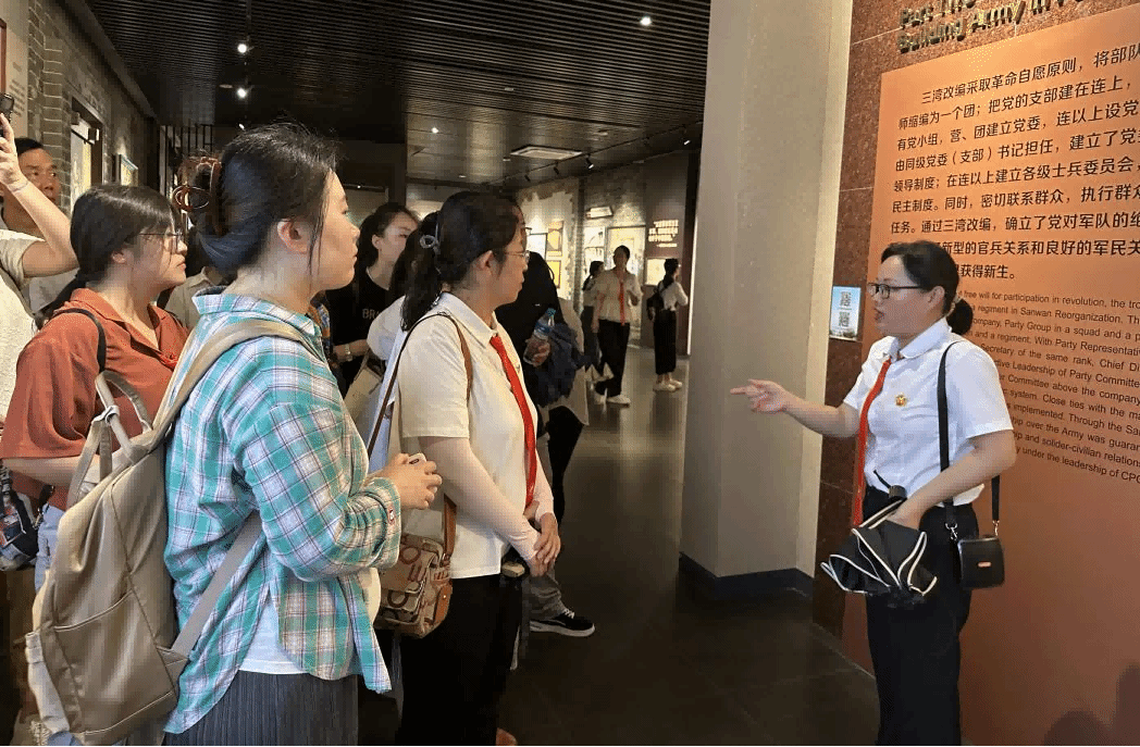 在三湾改编旧址群,全体教师在井冈山大学蒋媛萍老师的讲解下重温了那段革命岁月。1927年工农革命军在毛泽东的领导下,创造性地提出了“支部建在连上”“官兵平等”等崭新的治军方略,奠定了党对军队绝对领导的组织基础,开辟了人民军队从胜利走向胜利的光辉道路。随后,全体学员又参观了三湾改编纪念馆,从陈列的图片文字和历史文物中,再一次回顾了“三湾改编”的伟大历程,深刻体会了我党在面临内外交困局面时,坚定信念、实事求是、排除万难、艰苦奋斗的革命精神。