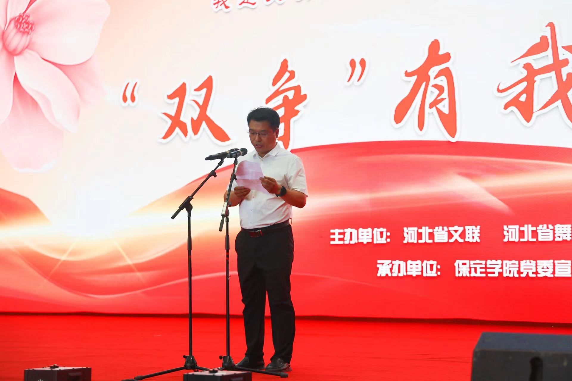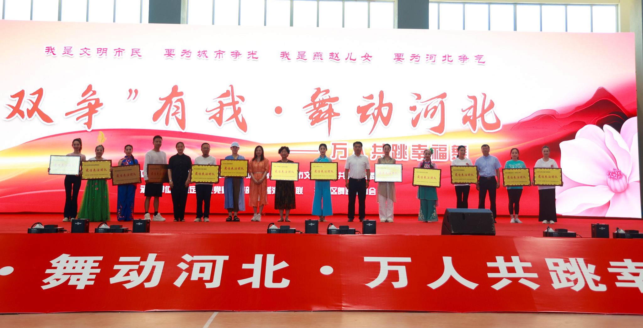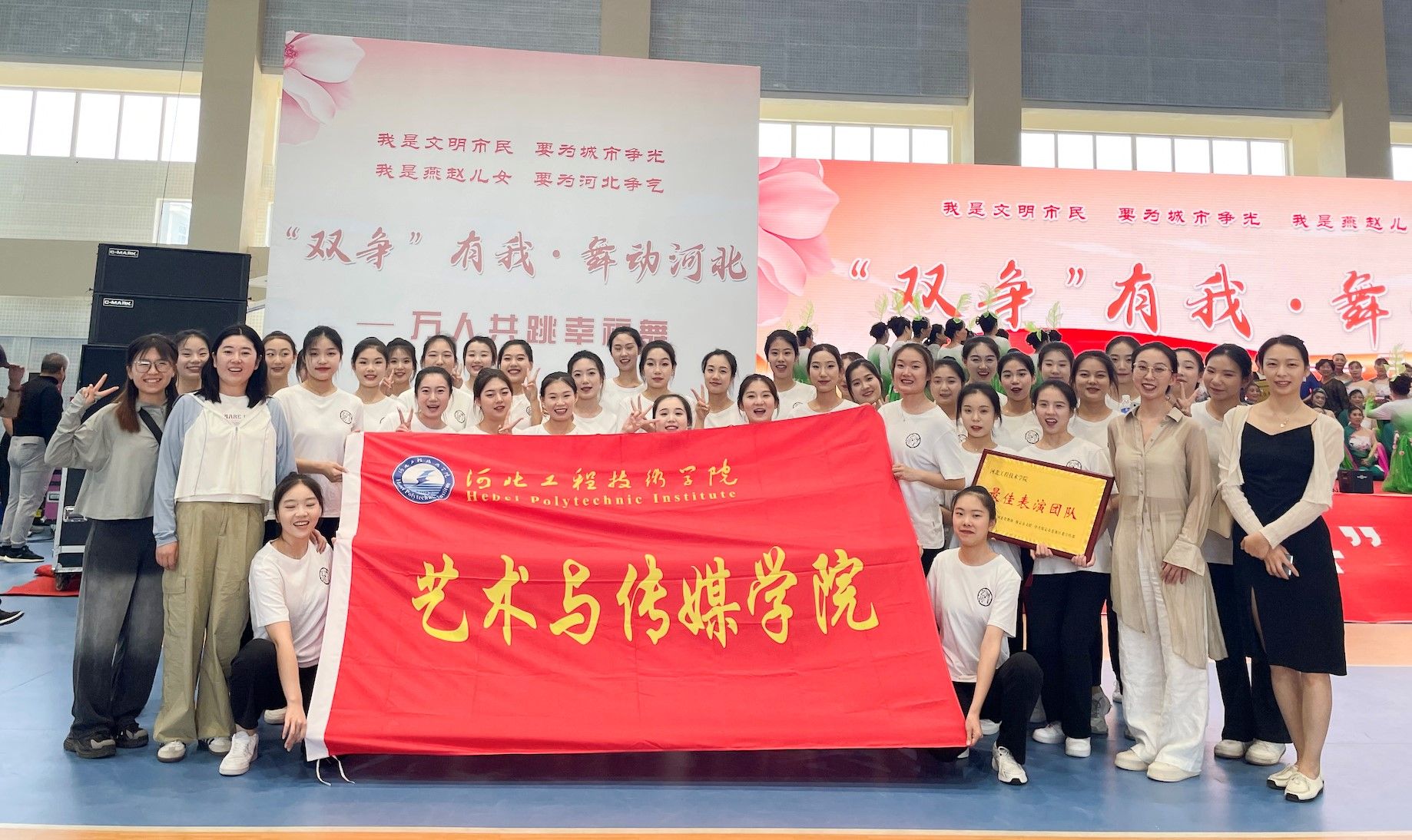 仪式开始,13支来自河北各地的舞蹈队进行舞蹈展演。“五月榴花红胜火,六月荷花绽芳菲;红心向党赞盛世,舞动河北颂党恩。”随后200人舞动红绸,在保定学院体育馆共跳舞蹈《幸福红》,场面壮阔、激情洋溢。由艺术与传媒学院舞蹈系选送的舞蹈《东西南北共和舞》,用不同民族的舞蹈动作,抒发着爱家乡、爱河北,感党恩、颂党情的深挚情感,最终荣获“最佳表演团队奖”。