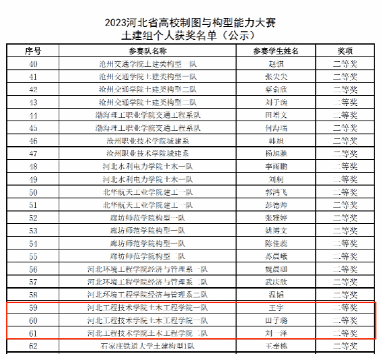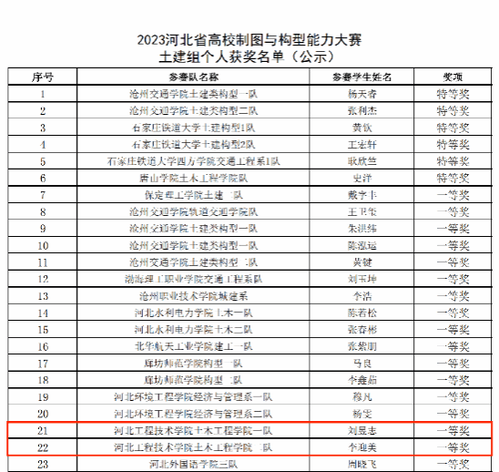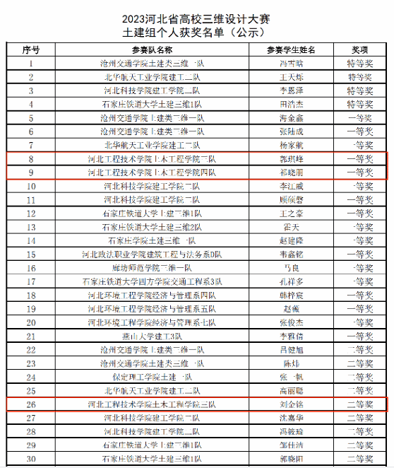 近日,由河北省教育厅主办的“河北省高校制图与构型能力大赛及三维设计大赛暨第十六届全国大学生先进成图技术与产品信息建模创新大赛”结果公布,由土木工程学院教学副院长杜慧慧领队,赵利军、王婷、李静文、白硕四位教师指导的四支参赛队伍,获得一等奖4项,二等奖6项,三等奖5项的好成绩。