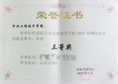 为增强网络安全意识,提升网络安全工作保障能力,党政办公室网络与信息安全中心参加了由省教育厅举办的河北省高等学校2023年网络安全技能竞赛,并荣获三等奖。