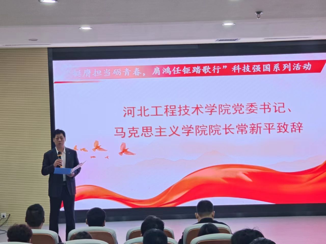 常新平书记为本次活动开幕式致辞。他为在座师生介绍了科技创新在发展新质生产力及助推经济高质量发展中的关键地位和作用。常书记还勉励青年学子务必要着眼长远、夯实基础、练就本领,不断增强解决科学问题的能力,更加自觉地担负起时代赋予青年的光荣使命,为加快实现高水平科技自立自强贡献河工青年学子的智慧和力量。