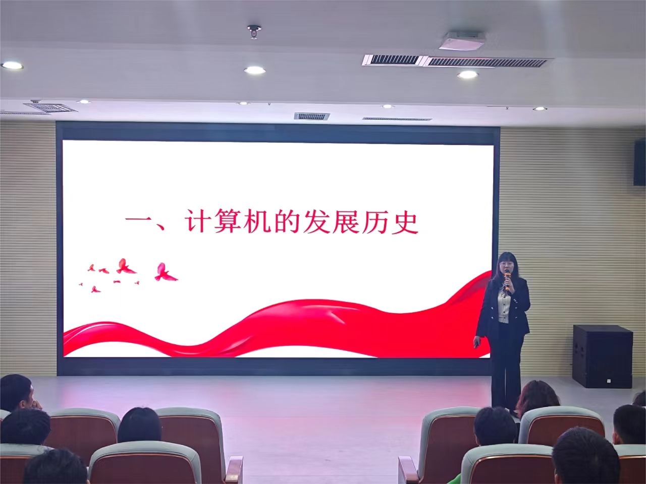 马克思主义学院李亚鑫老师和人工智能与大数据学院刘孟祎老师开启本次活动第一讲“科技引领未来,创新驱动发展”。刘孟祎老师从计算机在我们生活中的应用领域切入,重点讲述了计算机的发展历史以及我国计算机发展所取得的的举世瞩目的成就。李亚鑫老师则运用新颖、丰富的案例和视频,为学生讲述了加快建设科技强国的重要举措,并引导学生不仅要心怀科学梦想,还要树立创新志向,努力成长为堪当民族复兴重任的时代新人。