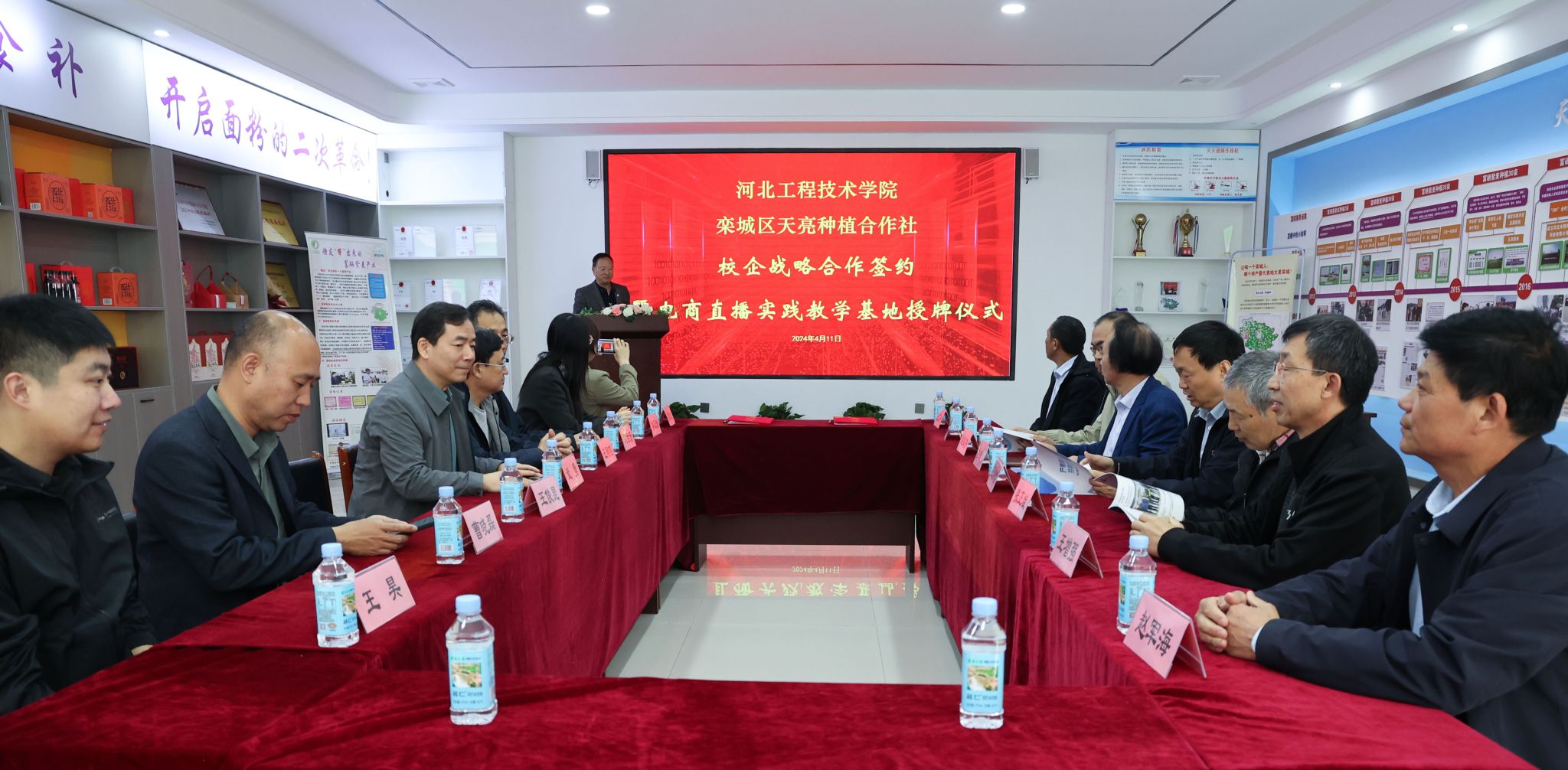 天亮种植合作社董事长赵军海首先带领大家参观了富硒紫麦产品展厅,并介绍了合作社的发展历程、相关富硒农产品以及未来的战略规划,随后举行了校企合作签约授牌仪式。
