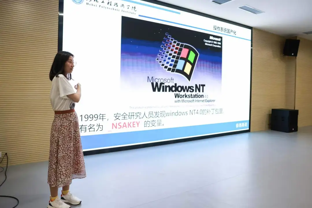 马克思主义学院范凯轩老师和网络空间安全学院(软件学院)雷迪老师以操作系统自主化为切入点,生动讲述了中国科技自立自强与操作系统国产化之路。范凯轩老师以科技自主必要性为主题,为师生讲述了从90年代我国面临的操作系统补丁变量造成的信息安全威胁,到今日华为被制裁所产生的信创行业发展危机。雷迪老师则以银河麒麟、华为鸿蒙等国产操作系统为例介绍了我国信创行业发展,明确国产操作系统的发展为我国网络空间安全、信息安全打造了坚实壁垒。