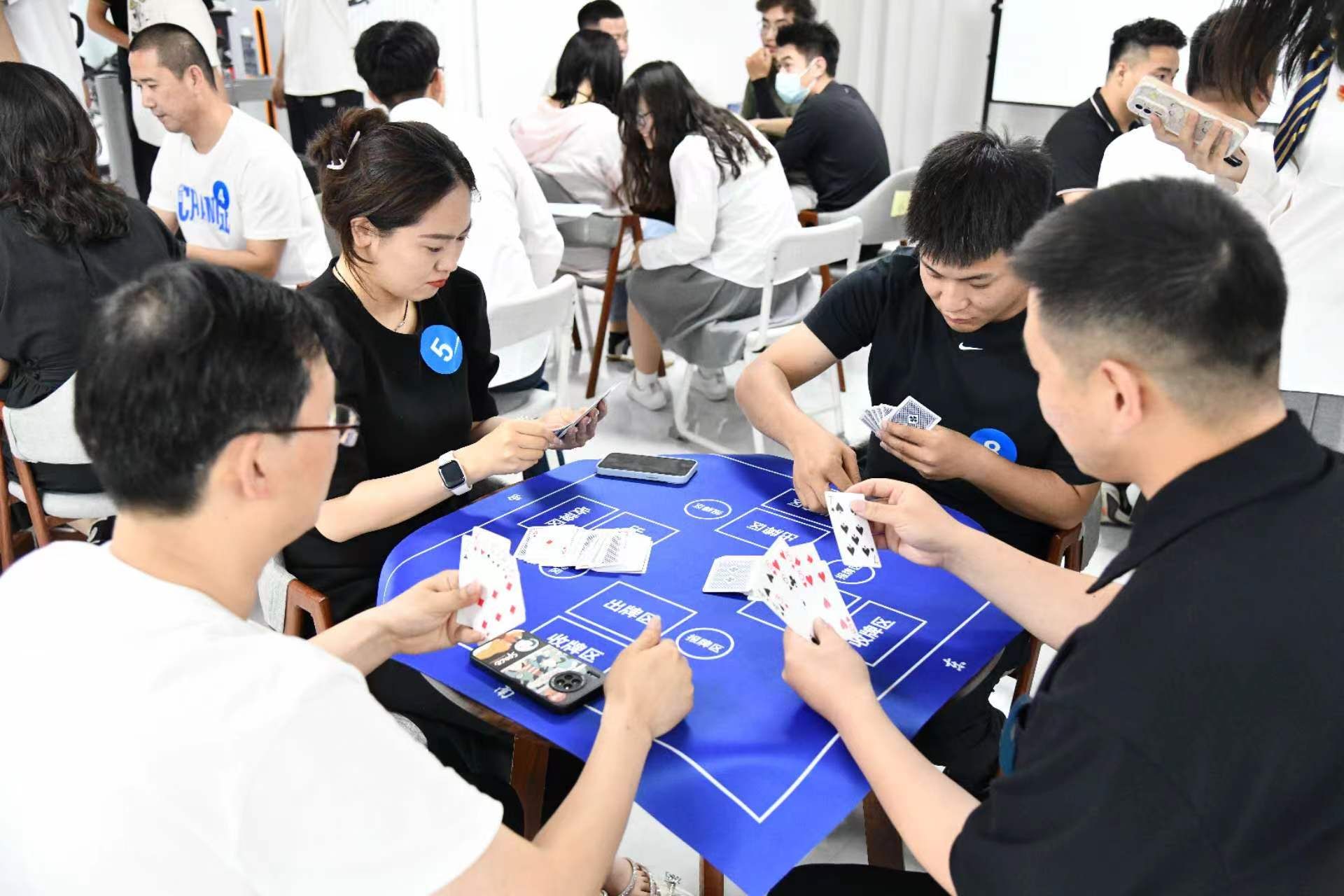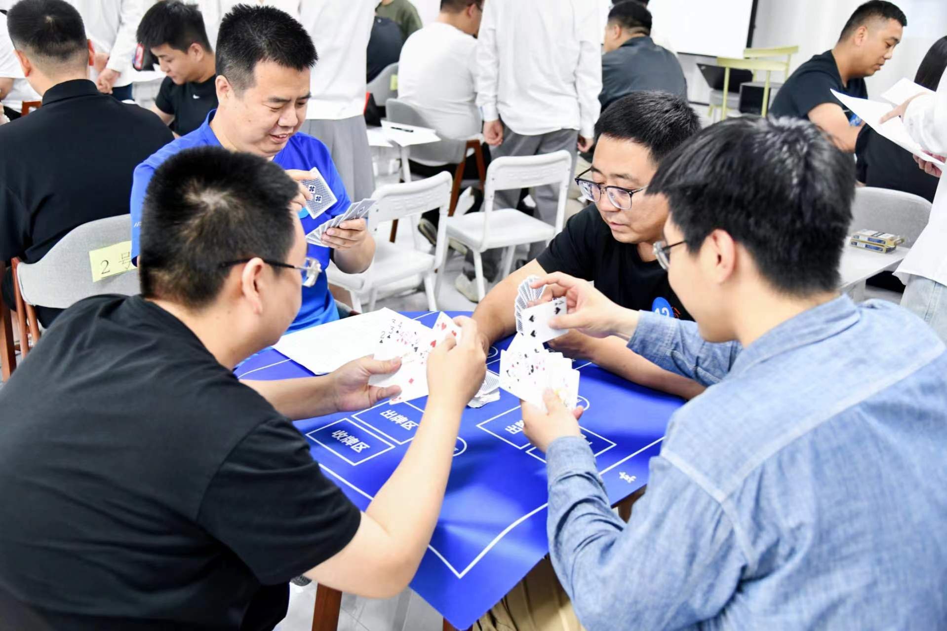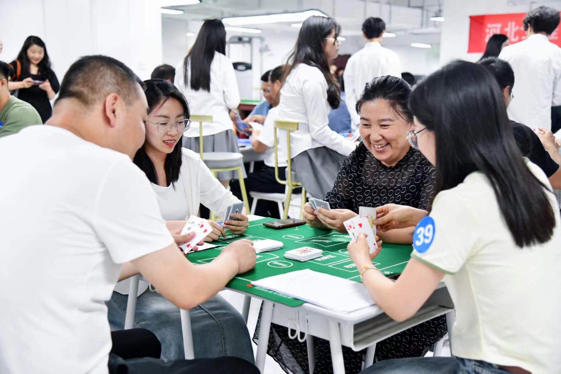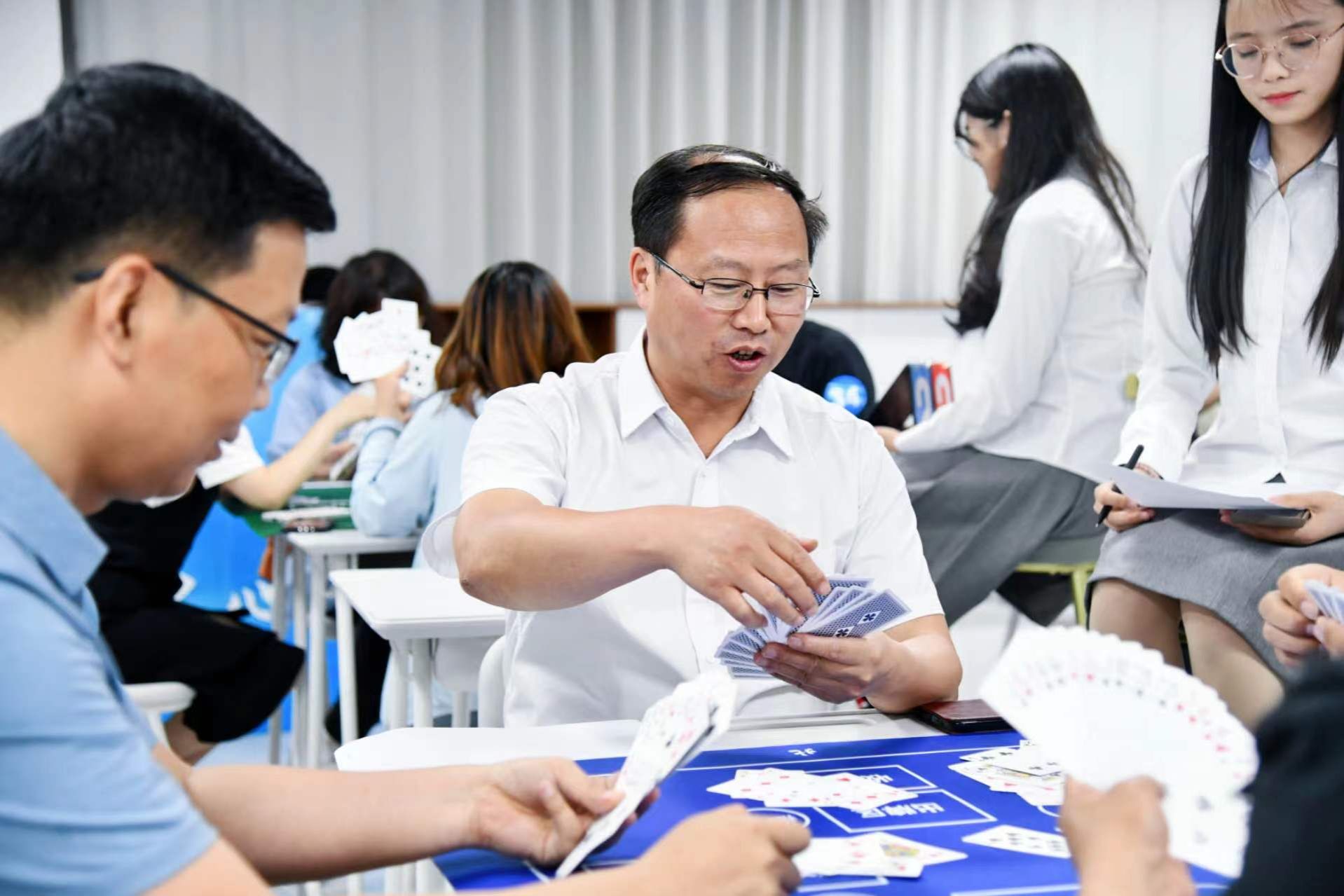 比赛现场,气氛轻松而热烈,我校掼牌(掼蛋)爱好者汇聚一堂切磋交流,竞技比拼一较高下。比赛中,搭档之间配合默契,通力合作,“对手”之间斗智斗勇,你追我赶。时而深思熟虑,思考出牌策略;时而果断出牌,大胆打断对手节奏。洗牌、切牌、出牌......一场场精彩对决在欢声笑语间轮番上演,每位参赛选手都发挥出超常的专注力和精湛的技术,将掼蛋文化与掼蛋技巧高度融合,不断把现场气氛推向高潮。