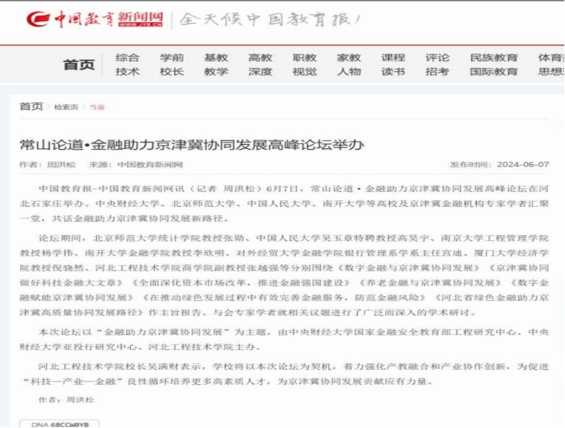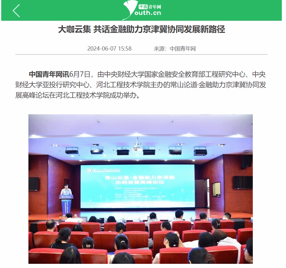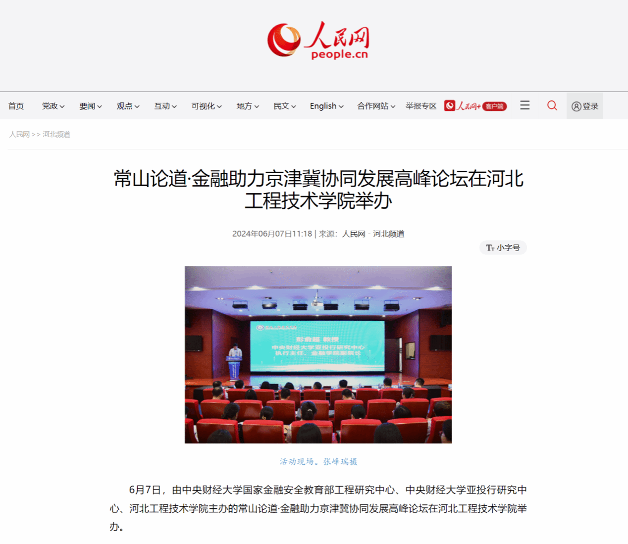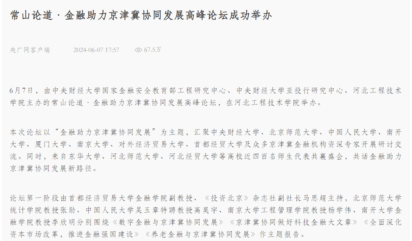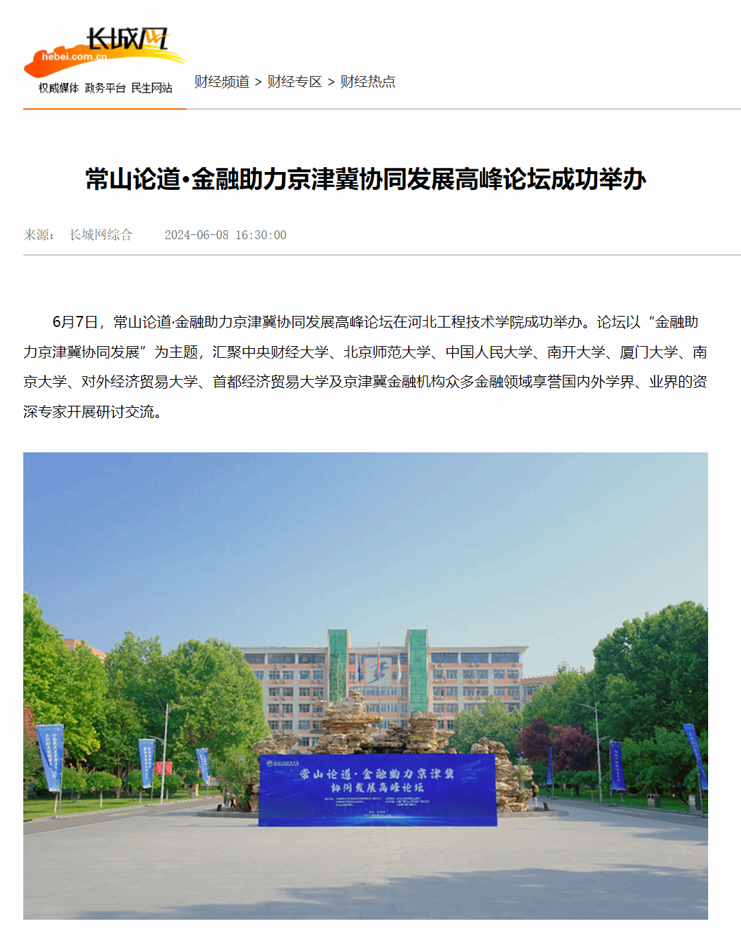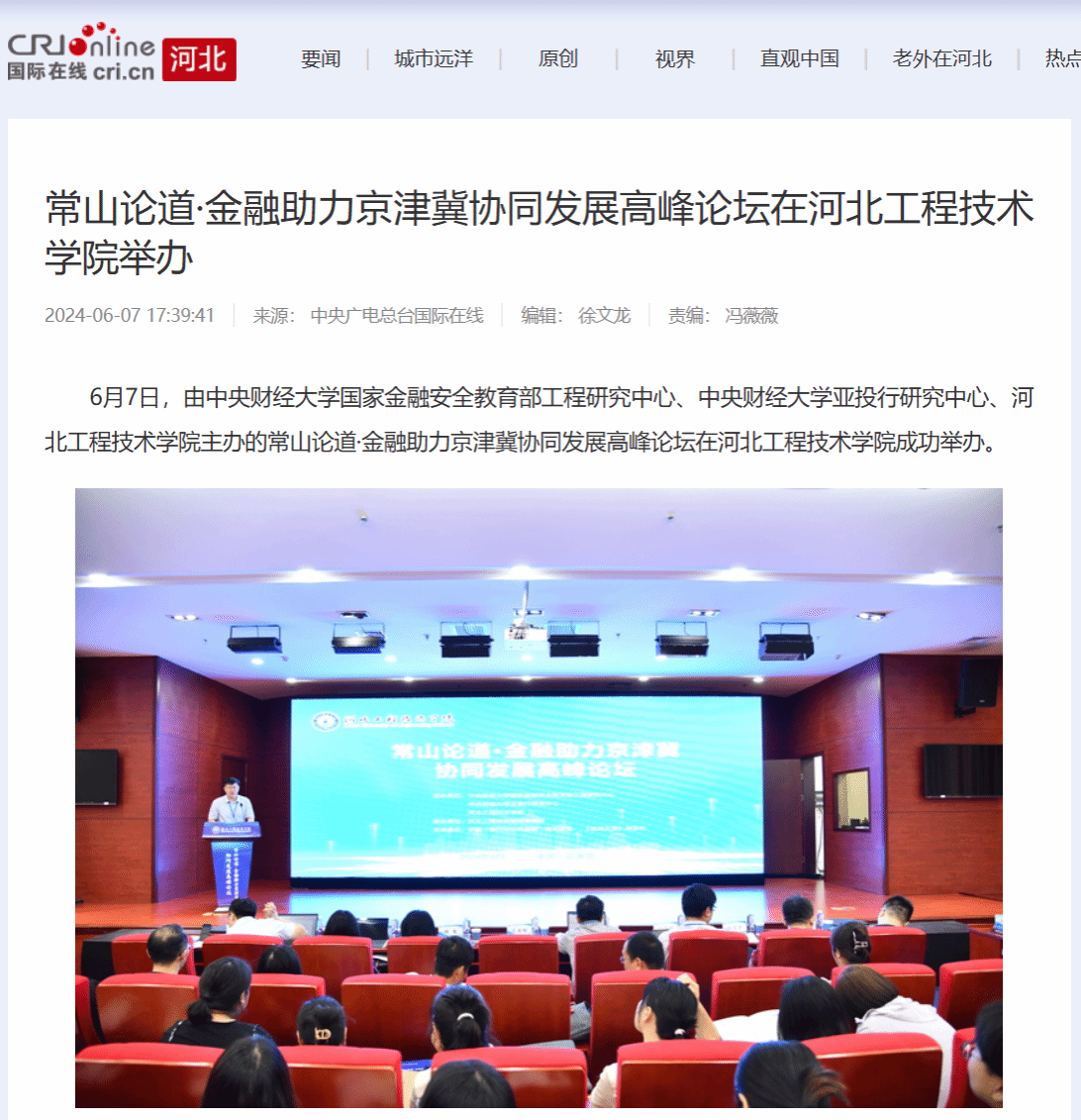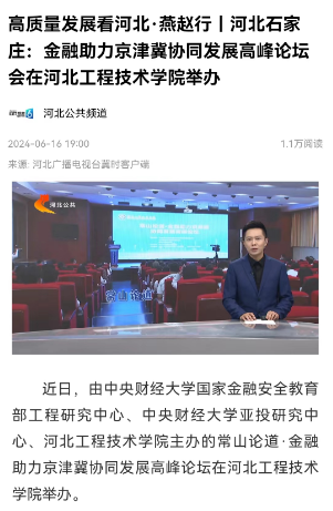 论坛以“金融助力京津冀协同发展”为主题,邀请了众多享誉国内外的金融领域资深专家分享最新观点,探索学术前沿。本届论坛亮点纷呈,成果丰硕,受到了业界的高度认可和各大主流媒体的广泛关注、争相报道,人民网、中国教育新闻网、中国青年网、中央广电总台国际在线、央广网、央视频及河北新闻网、纵览新闻、长城网财经频道头条、冀云、河北公共频道(高质量发展看河北)、今日头条、冀时等多家主流媒体对高峰论坛进行了集中报道,并得到了河北省教育宣传中心冀教新视界转发,引发强烈社会反响。