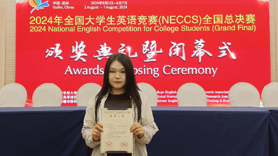 近日,2024年全国大学生英语竞赛(NECCS)全国总决赛圆满落下帷幕。作为国内规模最大、影响力最广的全国性大学生英语综合能力竞赛,此次总决赛吸引了来自全国29个省、自治区、直辖市208所高校的367名顶尖选手参与角逐。其中,我校人工智能与大数据学院2022级数据科学与大数据技术二班的魏坤烨同学荣获全国总决赛英语演讲比赛优秀奖。