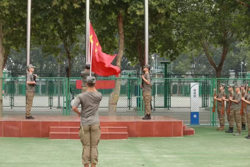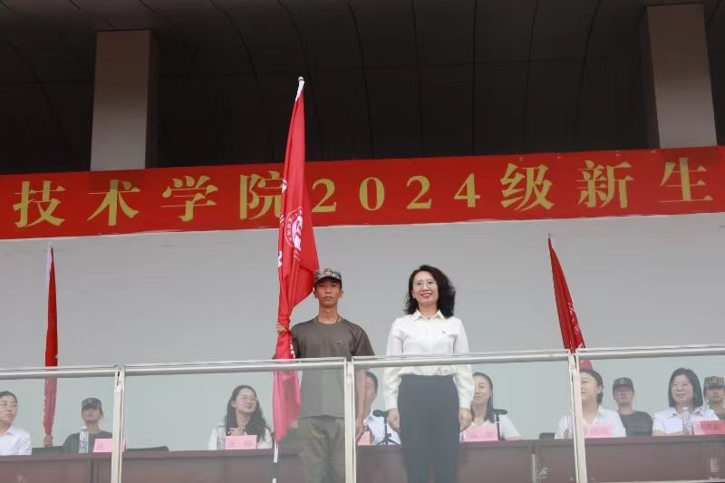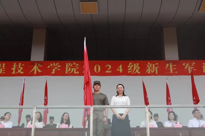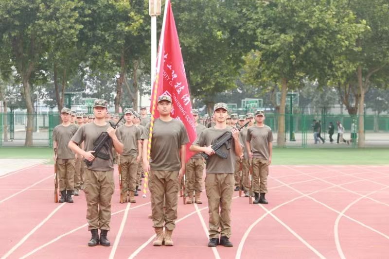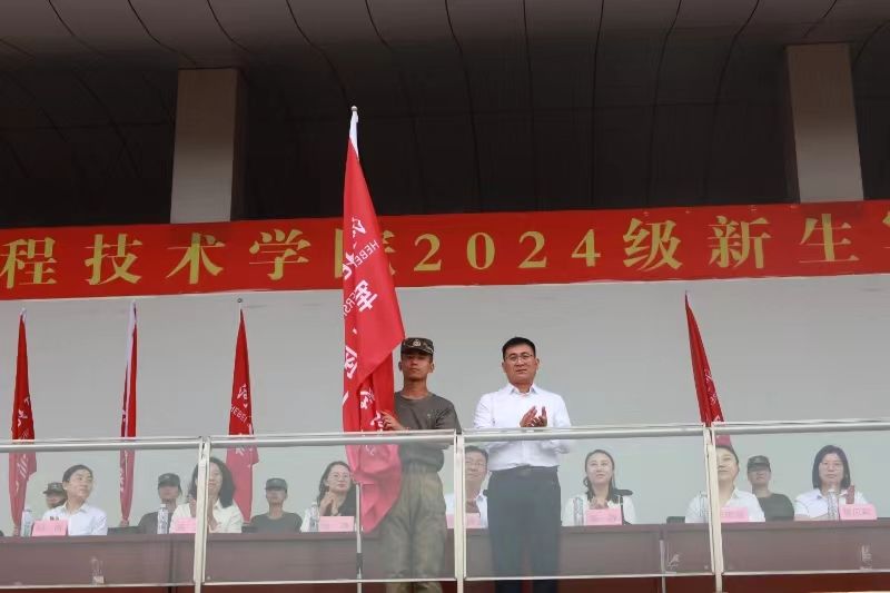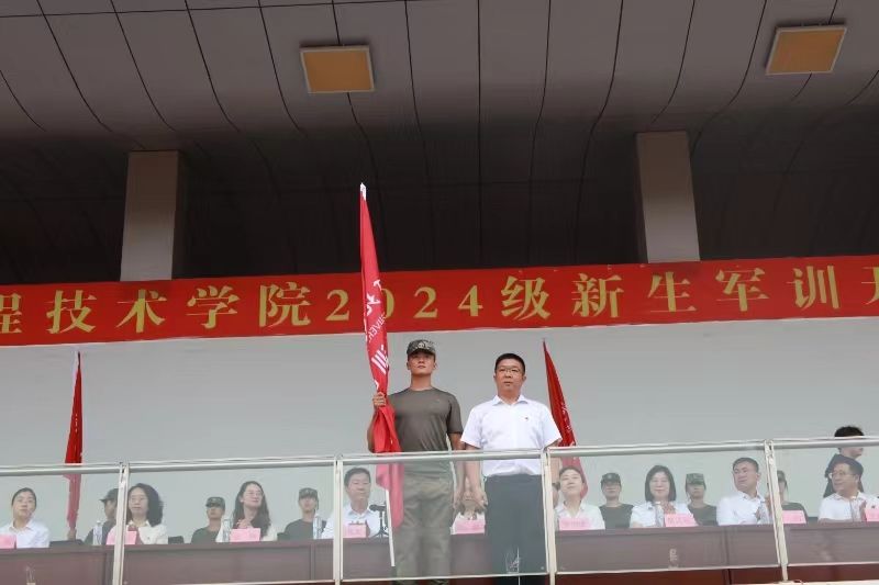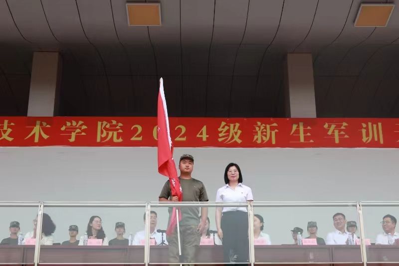 开训式上,校长助理刘喜贵为新生军训团授予团旗,学生工作处处长郭静为军训团的特色营进行授旗,各学院学管副院长为各自学院的军训营进行授旗。