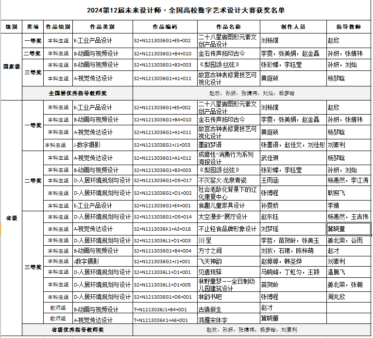 艺术与传媒学院师生在本次比赛中表现出色,经过激烈的竞争成功荣获国家级一等奖一项,二等奖一项,三等奖两项,省级一等奖四项,二等奖五项,三等奖十项。教师赵欣,孙妍,张婧祎,刘灿,杨梦晗荣获全国赛优秀指导教师奖。教师赵欣,孙妍,张婧祎,杨梦晗,刘素利荣获省级优秀指导教师奖。