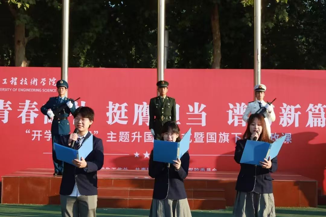 校大学生广播台的成员们进行了《迎新程 扬国志》为主题的朗诵。他们表达了对新学期的无限憧憬与对未来的殷切期盼,鼓舞着在场的每一个同学以更为昂扬的斗志投身于学业与生活之中,誓以青春之名,绽放奋斗光彩。