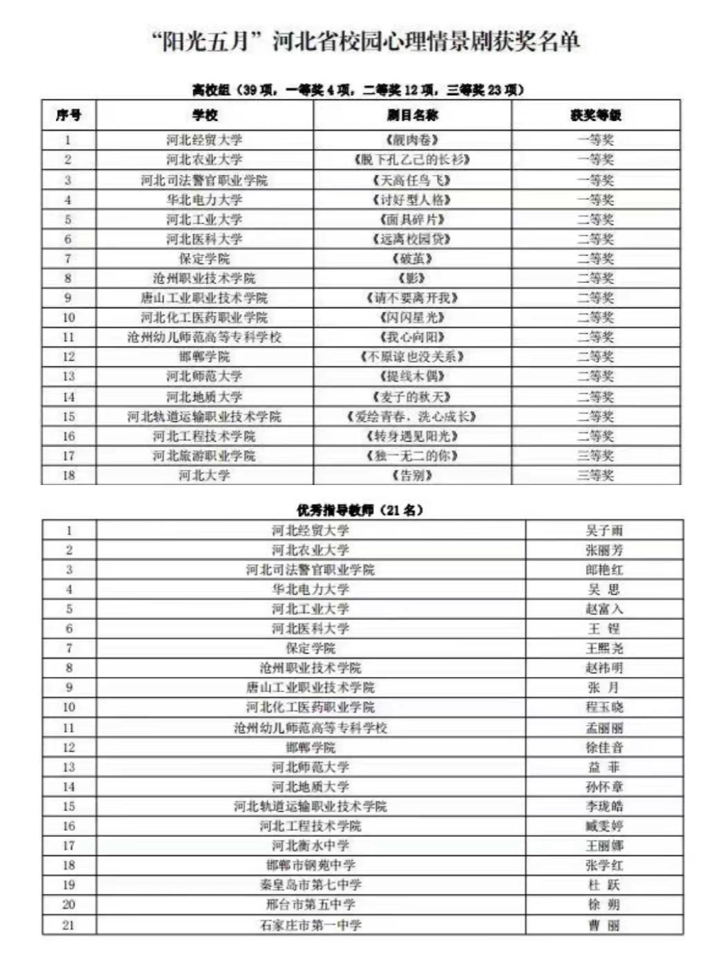 育人先育心,为深入贯彻党的二十大精神,落实立德树人根本任务,促进学生心理健康和全面发展,省教育厅组织开展了首个河北省学生心理健康宣传教育月评选活动。我校高度重视,积极参与,经专家评审,我校选送的校园心理情景剧《转身遇见阳光》获得省级二等奖、素质教育学院心理健康教育中心臧雯婷教师获得优秀指导教师称号。