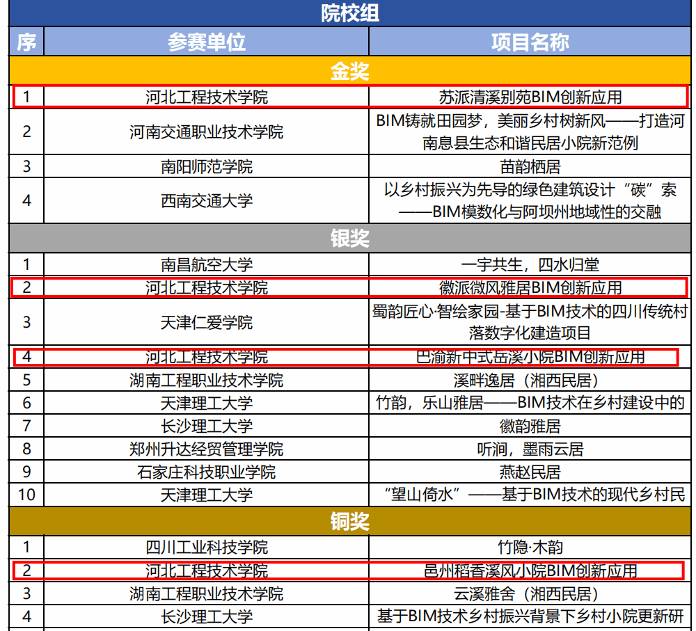 在学院教师赵利军的悉心指导下,四个参赛项目脱颖而出,其中,“苏派清溪别苑BIM创新应用”项目荣获全国金奖;“徽派微风雅居BIM创新应用”与“巴渝新中式岳溪小院BIM创新应用”两个项目则斩获全国银奖;“邕州稻香溪风小院BIM创新应用”项目也荣获全国铜奖,为学院增添了又一荣誉。