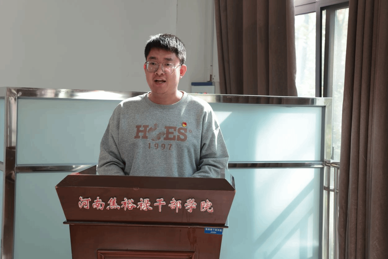 仪式上,教师代表杨栋彬作学习汇报发言。培训期间的课程形式生动、内容丰富,给杨老师留下深刻印象,尤其是作为学员代表在《您好 焦裕禄》中扮演了“魏铎彬”的角色(焦裕禄受村民魏铎彬翻淤固坟的启示找到了治理风沙的科学方法),他激动的说:“当时,我从‘台下’走到‘台上’,从‘观众’变成‘魏铎彬’的时候,我就在想,这是我离焦书记最近的一次,如果我遇到当时兰考人民的问题,我会怎么做呢?焦裕禄同志始终把人民的利益放在首位,心中无我,只装人民,这不正是我们思政课上所讲的共产党人的初心吗?”