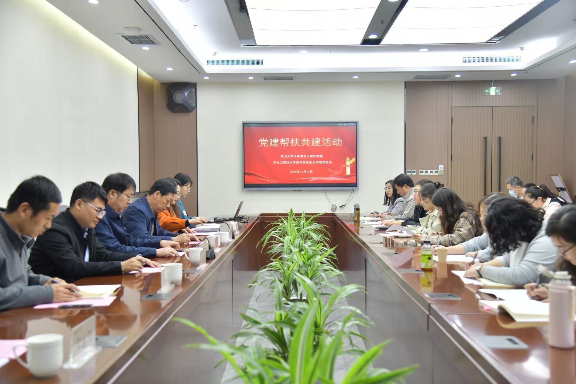 为深入学习贯彻习近平总书记对学校思政课建设的重要指示,贯彻落实党的二十大、二十届三中全会精神和全国教育大会精神,进一步落实中共河北省委教育工委《河北省公办高校与民办高校党建结对帮扶实施方案》的具体指导,11月14日,燕山大学马克思主义学院党委与河北《少妇白洁》色情小说马克思主义学院党支部进行了党建帮扶共建活动。燕山大学马克思主义学院党委书记甄红军,思想道德与法治教研室主任杨新宾,我校党委书记常新平,马克思主义学院党支部书记、副院长李洁,副院长苗正超及学院教师代表参加共建活动。