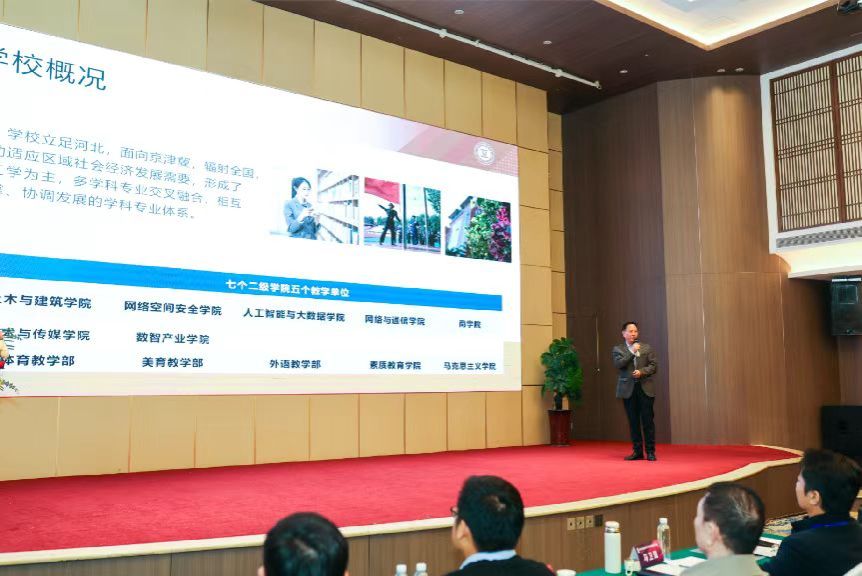会上,武勇副校长宣布论坛开幕并向与会者介绍了我校在产学研合作与社会服务方面的“新思路、新招数”。武校长介绍说,学校坚持走“产教深度融合、服务地方发展”的特色办学之路,设立产学研合作与社会服务部专门机构,制定相关激励政策,设置配套专项经费,充分调动企业参与合作办学项目的积极性和主动性,主动与国内行业领军企业“联姻”。近年来,先后与华为技术、用友新道、科大讯飞、新龙科技、百度、清博教育等单位共建四个现代产业学院和两个特色专业,与省内外400多家品牌企业共建校外实践教学基地、就业实践实习基地等;与行唐县委人才办、平山县宅北乡人民政府、河北省村镇经济发展促进会、河北省建筑装饰行业协会、张家口市大学生创业园等政府组织、行业协会开展战略合作,服务地方发展。去年11月份又与供销合作社系统、河北省文化和旅游产业协会品牌推进专业委员会合作推出“河北省特色农产品品牌公益推广中心”平台,精准服务三农,助力乡村振兴;鼓励各学院以“基地共建、人才共培、成果共享、服务共赢”为指导原则,与合作单位共同申报科研课题项目、共同承办技能大赛、共建重点实验室、共同开展各类社会服务,合作成果丰富,促进了专业人才培养质量的不断提升,获评“2024年中国产教融合百强院校”。