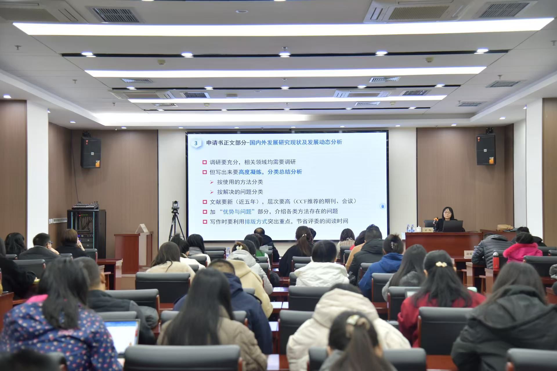 在这场学术盛会中,各教学单位负责科研工作的副院长、科研秘书以及众多青年骨干教师齐聚一堂,共同聆听了霍铮教授的精彩演讲。霍教授以其丰富的科研实践和深邃的学术洞察,为在座教师呈现了一场思想的盛宴。她详尽地解读了项目申报书的撰写技巧、展示了撰写范例,并分享了个人在申报自科基金项目中的经验和教训。霍教授特别强调了研究内容、研究意义、研究目标的重要性,并指导青年教师如何高度凝练项目的特色与创新点,为青年教师提供了宝贵的指导和示范。