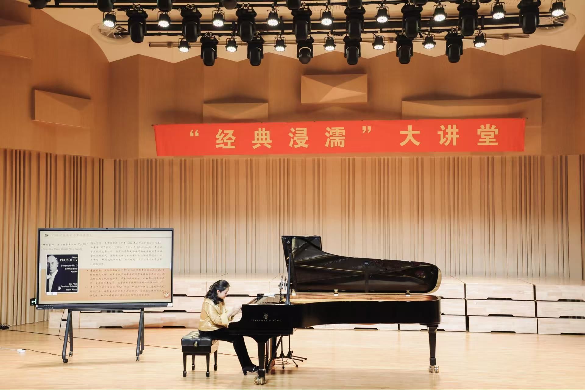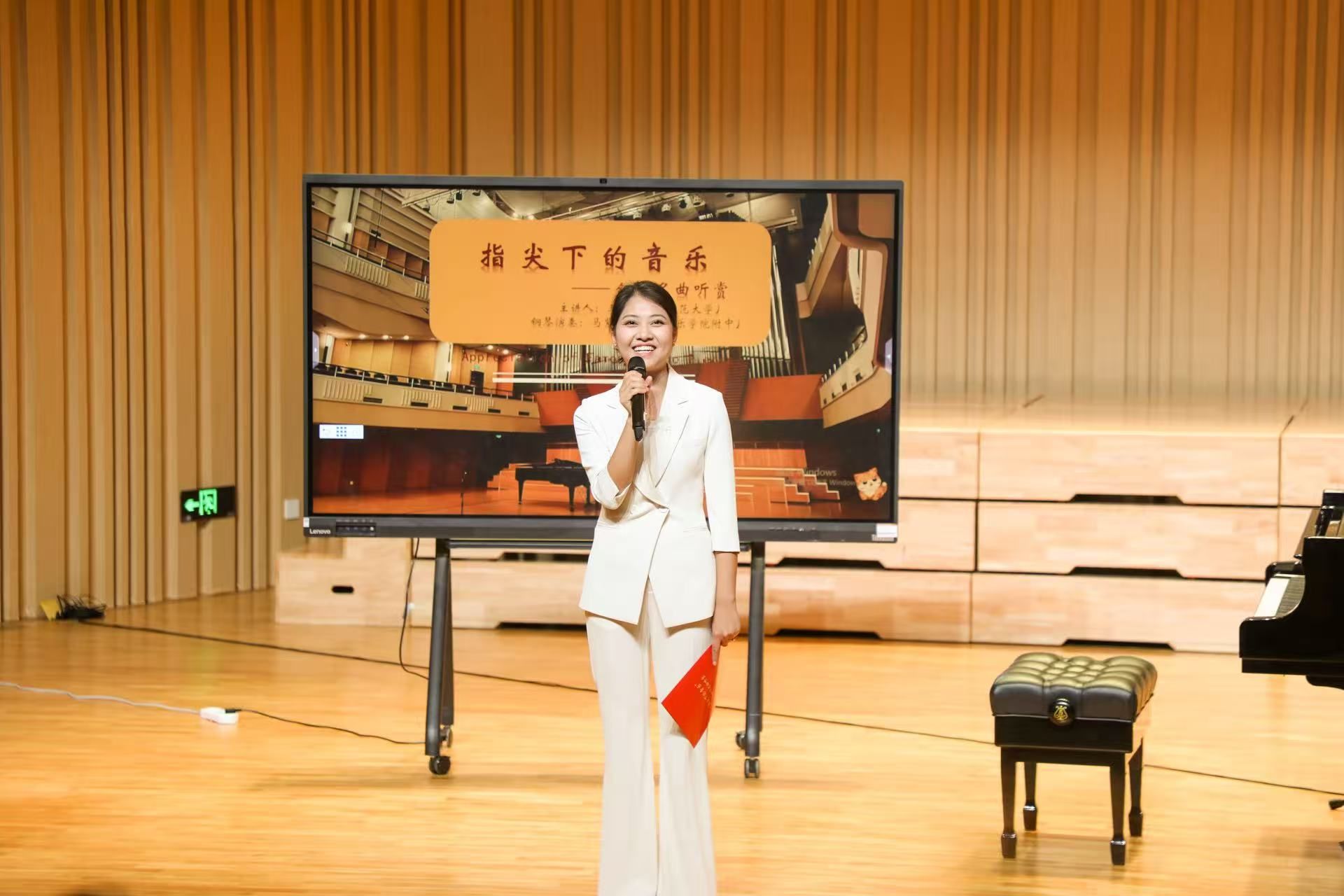 中央音乐学院附中钢琴专业马紫宸的精彩演绎,成为本场活动的亮点。她演奏了海顿、肖邦、普罗科菲耶夫、拉威尔、卡普斯汀的钢琴经典名曲。王晶教授对每首曲目进行了深度解析,她不仅揭示海顿作品中蕴含的数学逻辑之美,更阐释肖邦如何将祖国情怀熔铸为音乐密码;从普罗科菲耶夫的音色对比,到拉威尔作品中的光影变幻,每个音符背后都跃动着作曲家鲜活的精神世界。这种“导赏+演绎”的创新模式,让现场师生既饱尝听觉盛宴,更获得理解音乐的“金钥匙”。