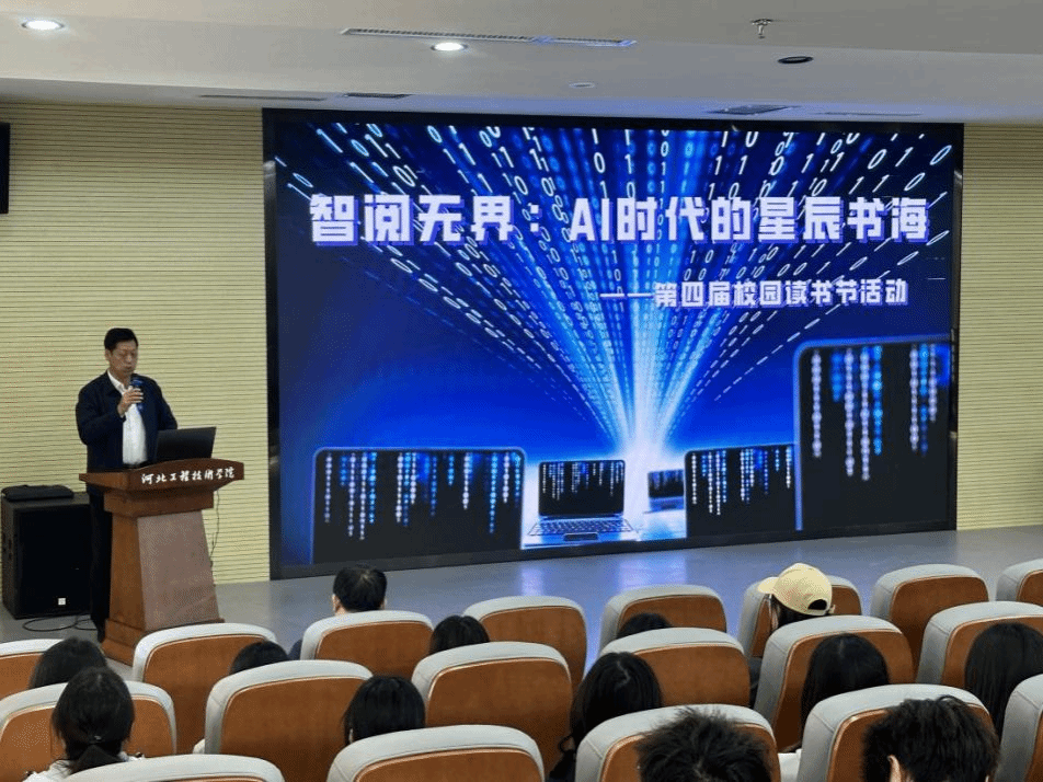 3月21日下午,第四届校园读书节启动仪式在图书馆五楼多功能放映厅举行。本届读书节以“智阅无界:AI时代的星辰书海”为主题,由图书馆主办。党委书记常新平,图书馆馆长张丽娟、副馆长刘春和及各学院学生代表共同出席了此次活动,共启科技与人文交融的阅读盛典。