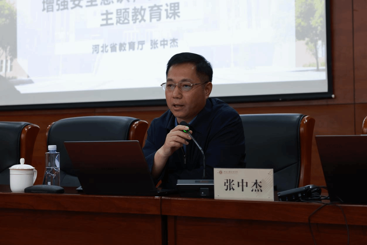 4月14日,我校在会议中心报告厅举办以“增强安全意识 强化责任担当”为题的安全教育讲座,河北省教育厅学校安全工作处张中杰处长作专题报告。副校长姜新佩、副校长刘喜贵、副校长郝爱青出席,各职能部门负责人、二级学院党总支书记及师生代表参加,讲座由副校长刘喜贵主持。