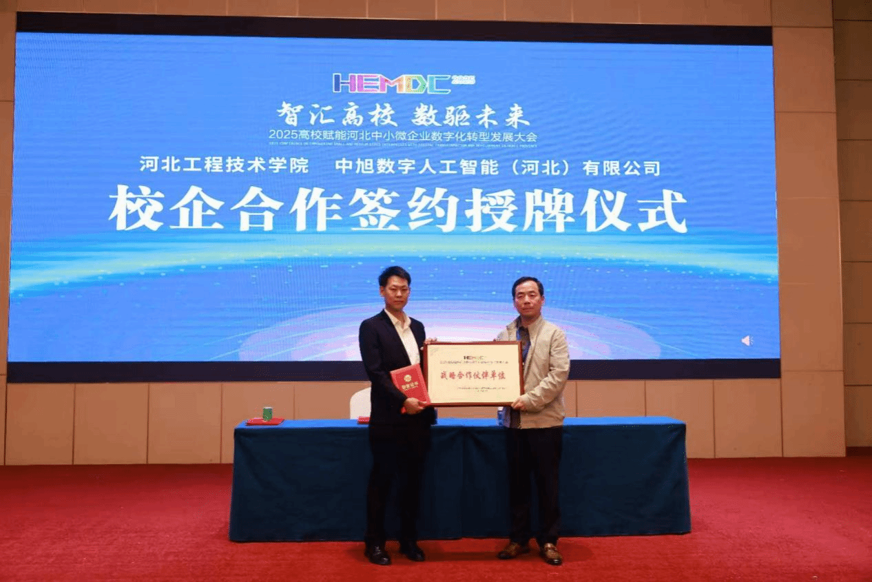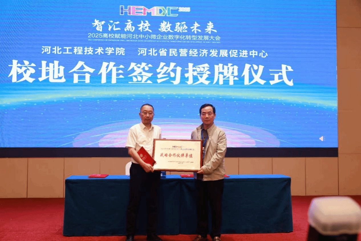 副校长武勇在大会致辞中强调,高校应发挥“智慧引擎”作用,助力企业数字化转型。他表示,学校将深化校企合作,提供“轻量化、低成本”解决方案,推动产业升级。会上,副校长武勇长代表学校与河北省民营经济发展促进中心、中旭数字人工智能(河北)有限公司分别签署校地战略合作协议和校企合作协议,并颁发战略合作伙伴牌匾,进一步推动产学研协同创新。