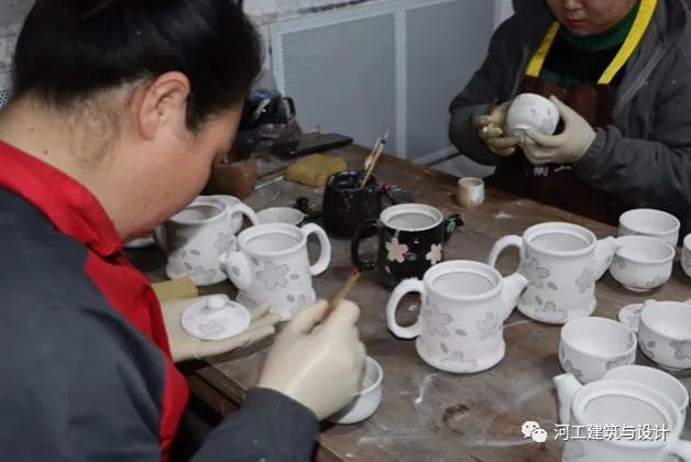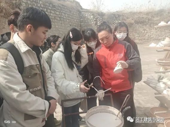在厂里贾工的带领下,我们由内而外,将工厂中的诸多车间全部走过了一遍,不仅看到了泥土和砂石是如何通过机器滚动清筛逐一分离的,看到了烧制机器是如何将质地柔软的初胚烘制成坚硬的陶制品,甚至还亲自进入了生产的工艺与步骤当中,体验到了为陶瓷胚上釉包浆的过程。令同学们增长了见识,也对其有了一个更深层次的感悟和理解。